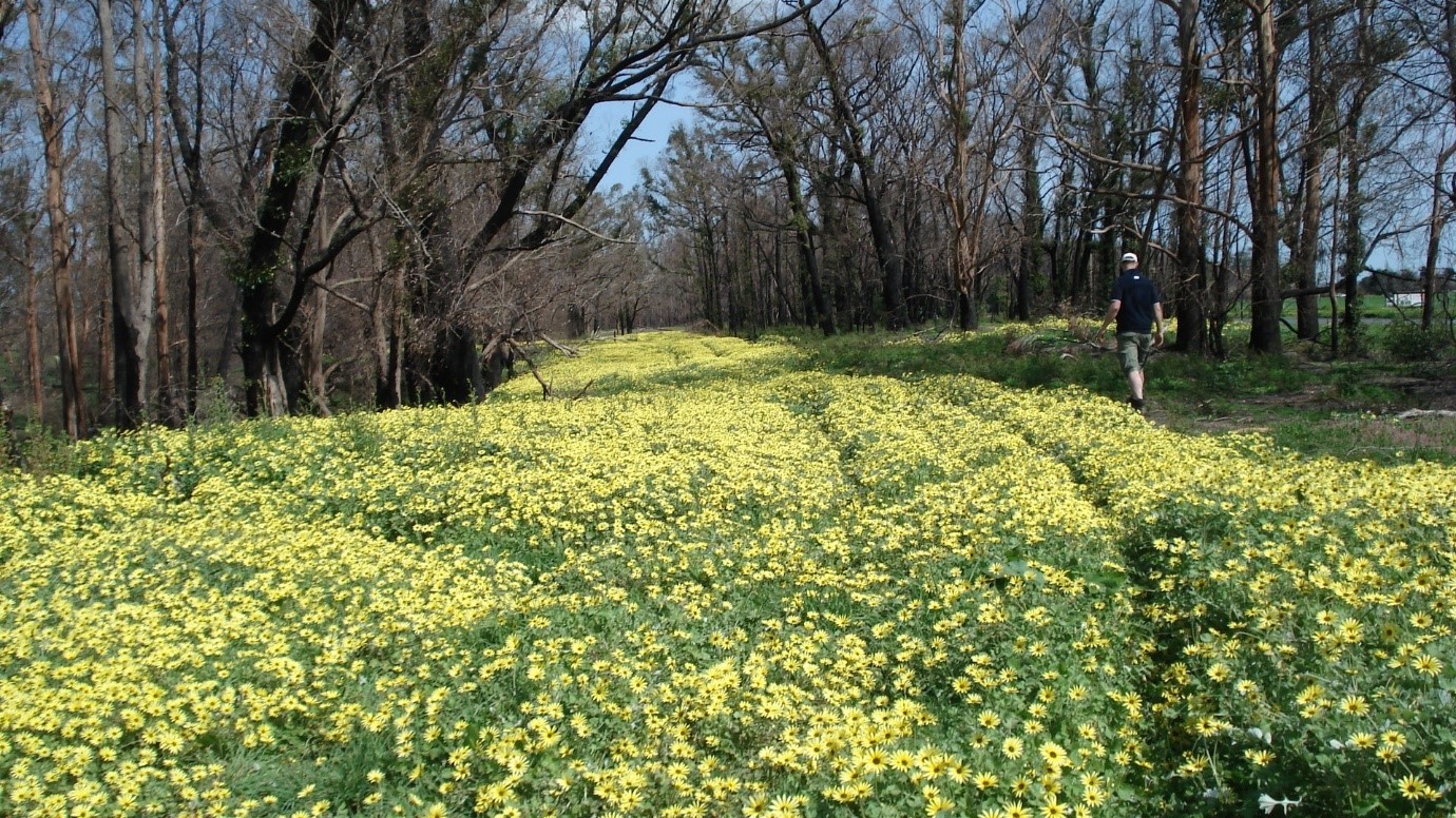 Figure 3. Colonising weed species can take advantage of bare ground post-fire and dominate where they previously were background weeds. Do they offer benefits as ground stabilisers?