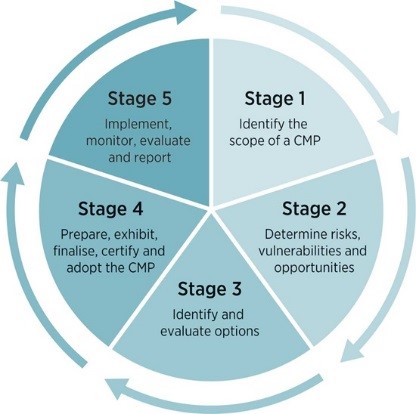 The CMP process is divided into five stages. Each stage contributes to producing a detailed coastal management program that identifies the management issues and outlines the actions to be implemented by the council or public authorities upon the certification of the CMP.
