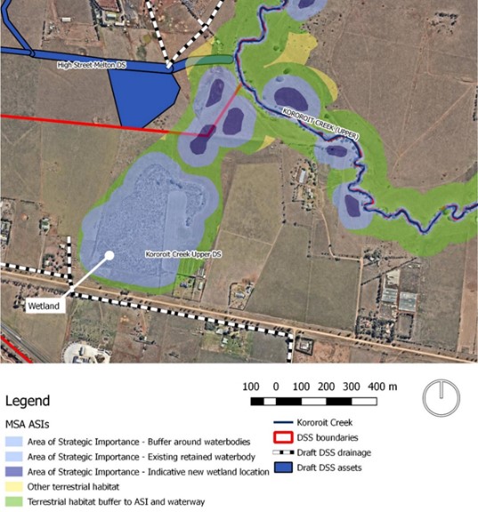 The wetland is listed in the impact of Melbourne’s growth on ‘seasonal herbaceous wetlands (freshwater) of the temperate lowland plains – Melbourne Strategic Assessment’. Approximately 7.5 Ha of the wetland area is considered to be SHW, which is listed under the Environment Protection and Biodiversity Conservation (EPBC) Act 1999. The wetland (including a buffer and proposed GGF wetlands between the wetland and Kororoit Creek) has a protection overlay in the Melbourne Strategic Assessment (MSA).